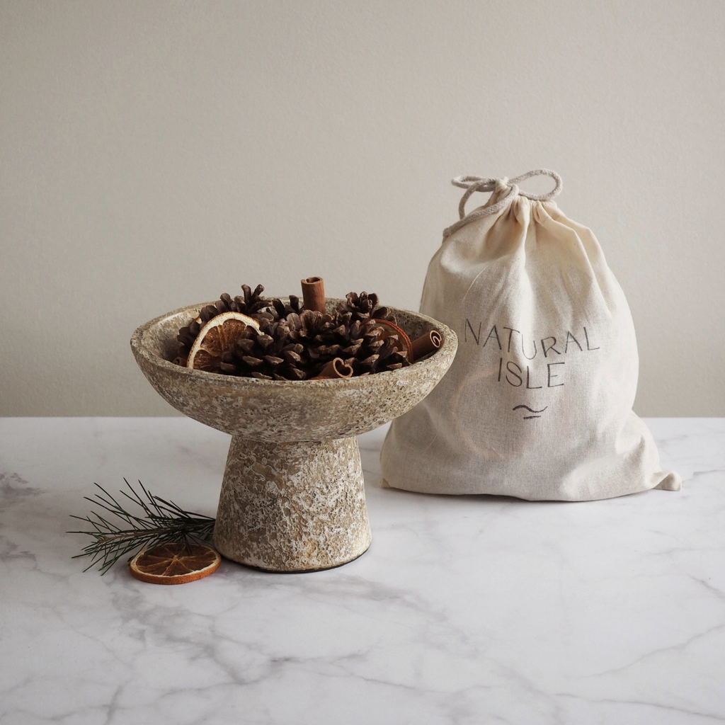 A magical mix of hand-collected pine cones, dried orange slices, cinnamon sticks and cloves will fill your space with a nostalgic, comforting scent this festive season. Pour the mix into a bowl to create a beautiful & natural centre piece. Your mix will arrive in our large Natural Isle cotton drawstring bag making it the perfect gift for a loved one or to treat yourself with.