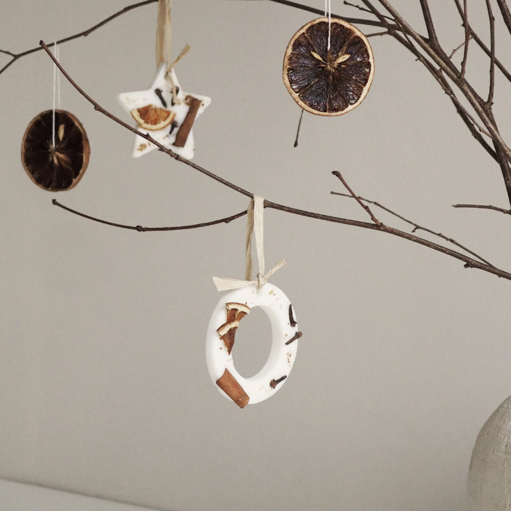 The Scented Tree Decorations/Wax Melts are back! Fill your home with the nostalgic scent of cinnamon, spiced orange & clove this festive season by hanging our Wreath Decoration on your tree. Lovingly handmade from soy wax and decorated with dried festive botanicals, the decorations are a unique and natural way to scent your home for Christmas. Once you've finished admiring the decorations hanging in your home, they can be broken up and used as wax melts to release the wintery scent further.